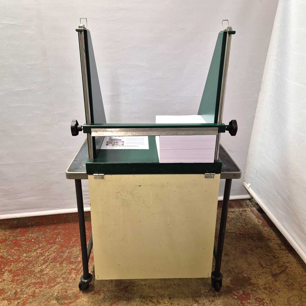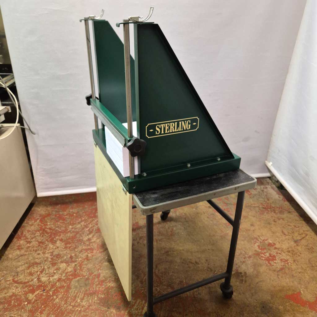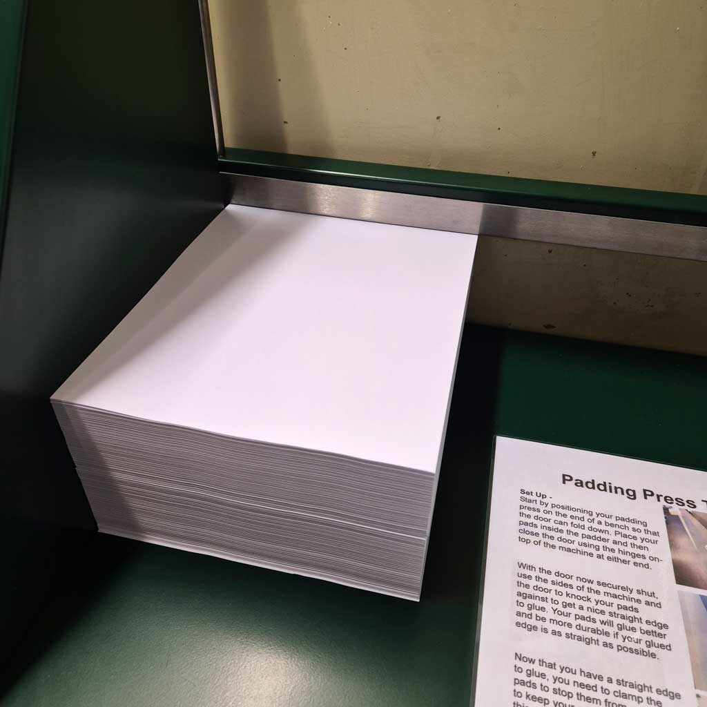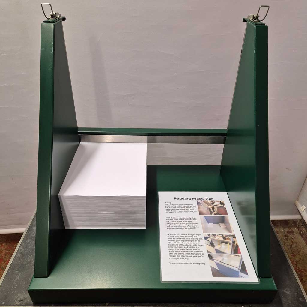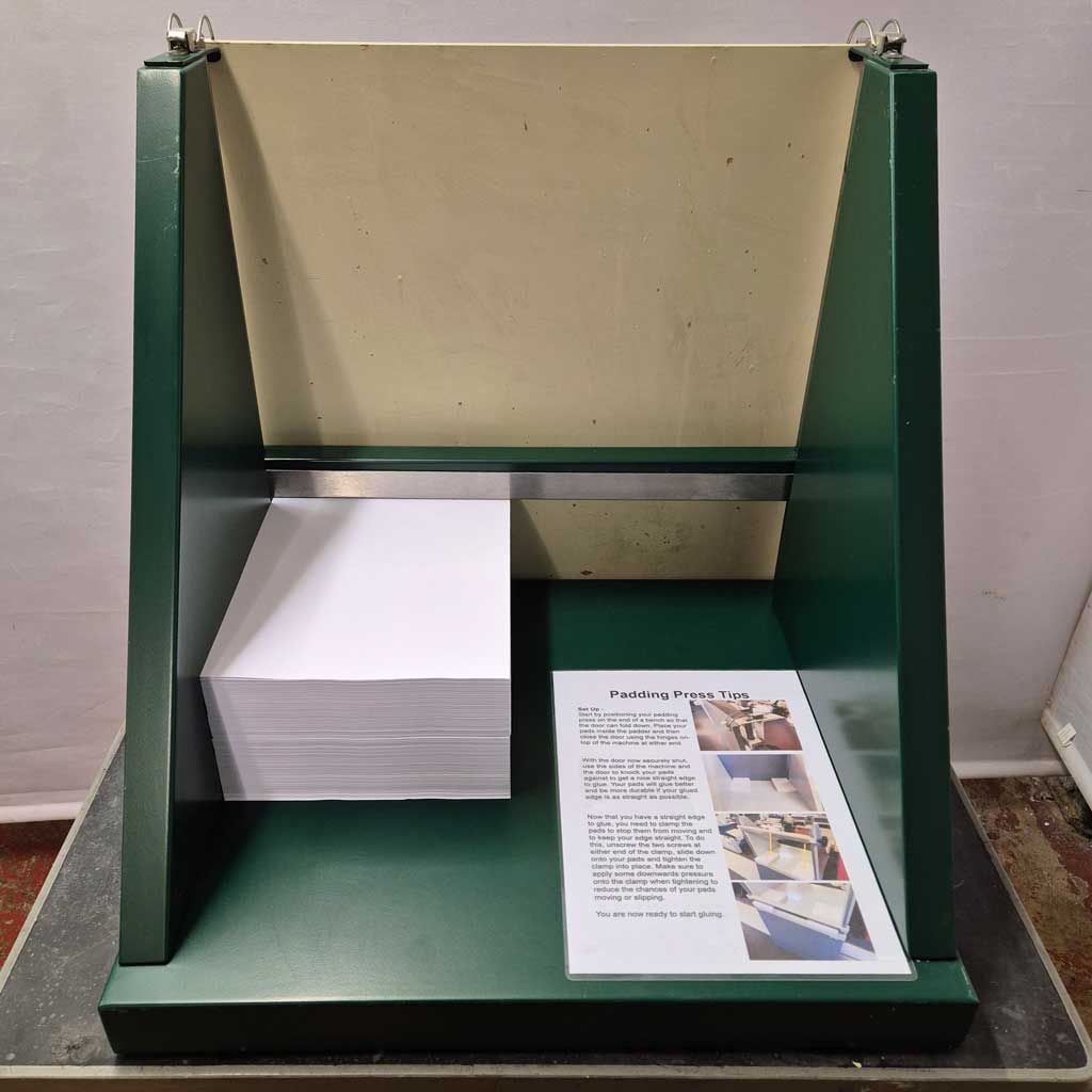 Simple to use and holds up to 10,000 sheets of A4 paper or 5,000 sheets of A3 size paper. It has a stainless steel sprung clamp that securely holds your stock. The Sterling padding press has a fold down gate which is ideal for boxing up your stock. You can view a short video on how to use this padding press below.