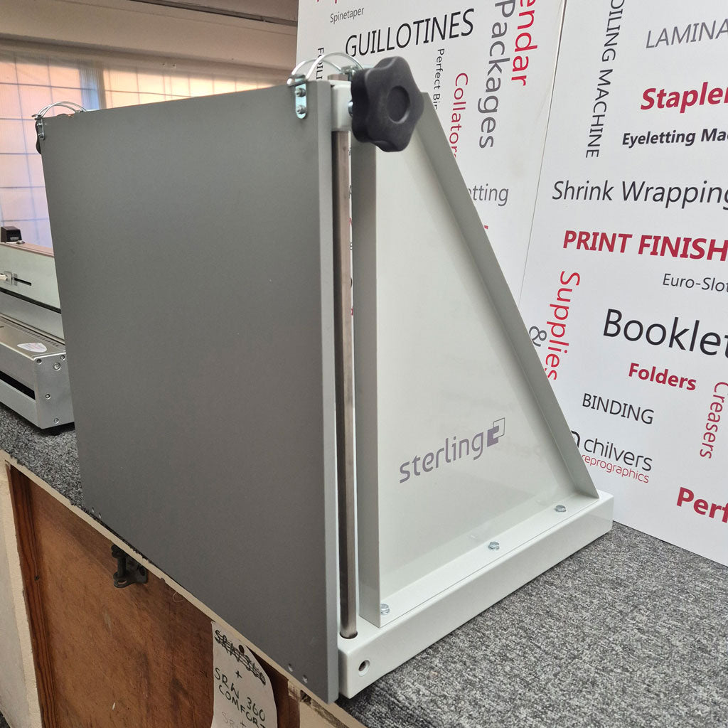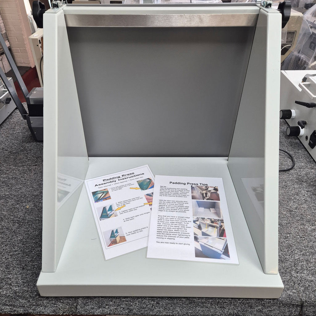 This is a budget padder and is ideal for fast reliable pad making of NCR sets, phone pads, note pads etc. Simple to use and holds up to 10,000 sheets of A4 paper or 5,000 sheets of A3 size paper. It has a stainless steel sprung clamp that securely holds your stock. The Sterling padding press has a fold down gate which is ideal for boxing up your stock. You can view a short video on how to use this padding press below.