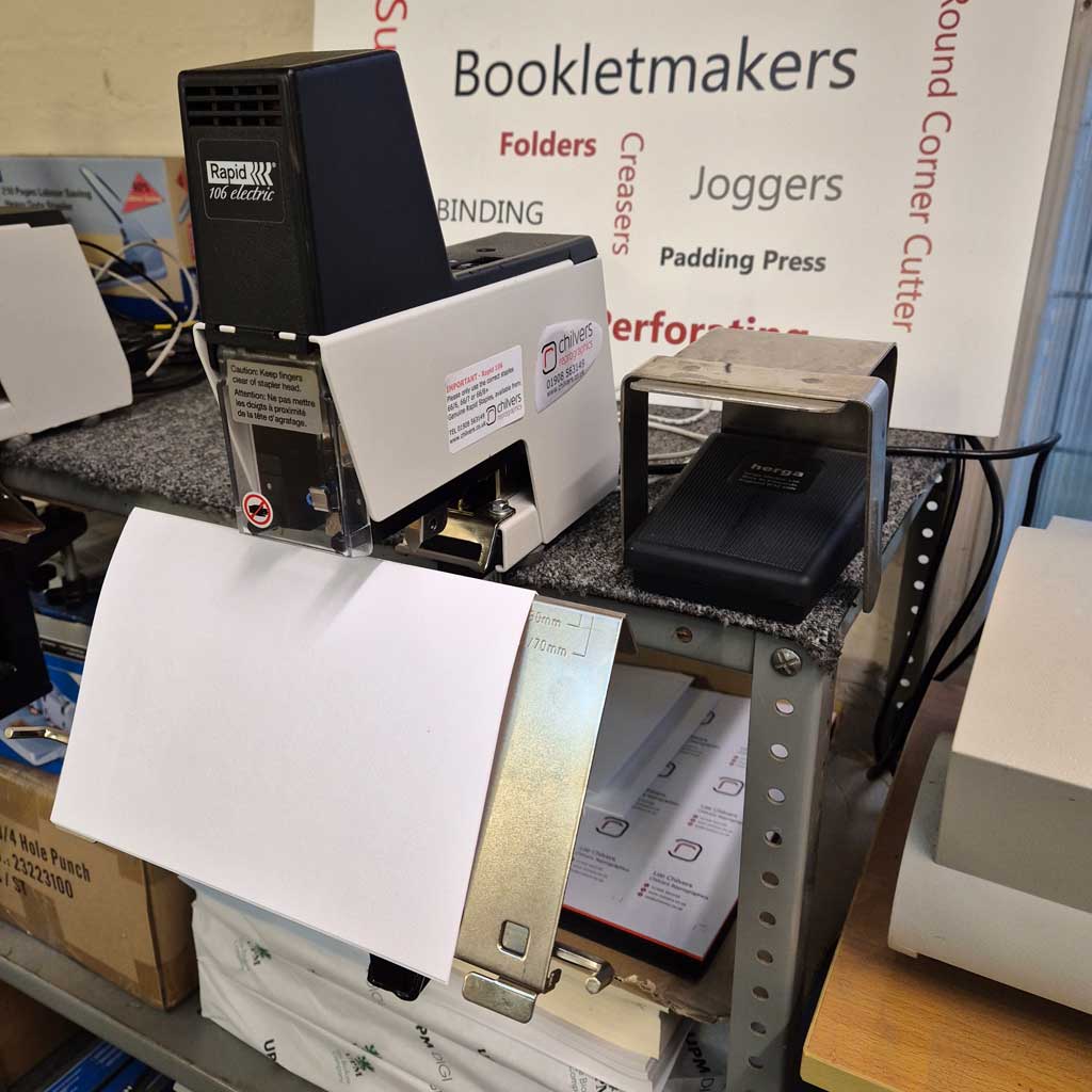 The Plockmatic 60 is a super cheap way to produce staple and folded booklets the staple head uses Rapid 66/6 staples costing around £4 per box of 5000.