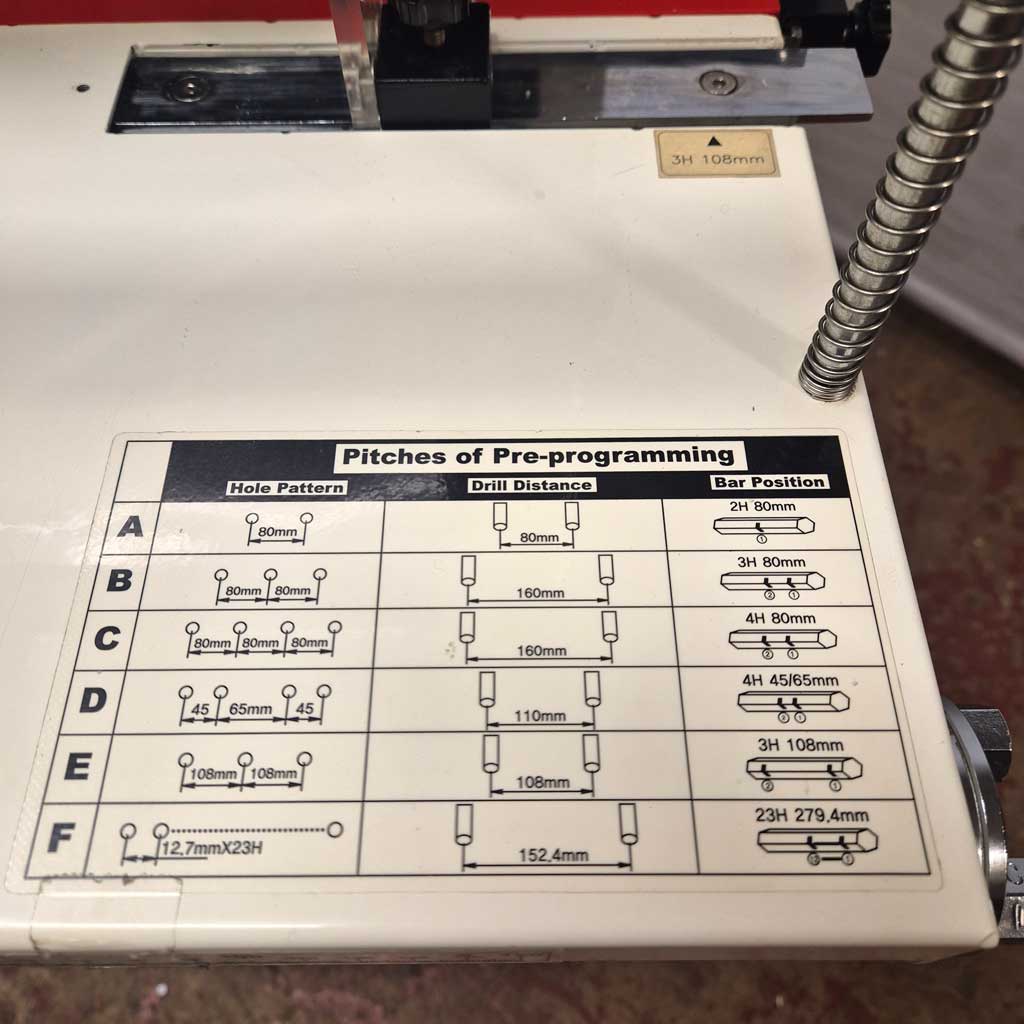 Easily adjust distance between drill heads from 45mm to 160mm. Comes fully equipped with program bar for 2 and 4 hole and an adjustable stops bar for any other positions.