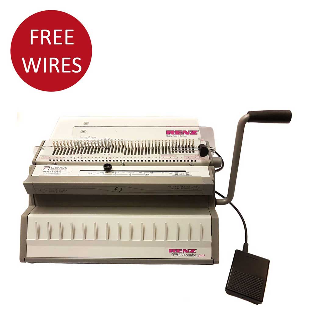 The new Renz SRW 360 ComfortPlus machine replaces the current model SRW 360 comfort. The new model has considerably improved punching speed with a motor that is twice as powerful. The wire binder has electric punching that is footswitch operated with a manual closer unit. This model has 3:1 pitch with square holes and is able to bind documents up to 135 sheets, it also comes with 250 FREE No 4 binding wires.