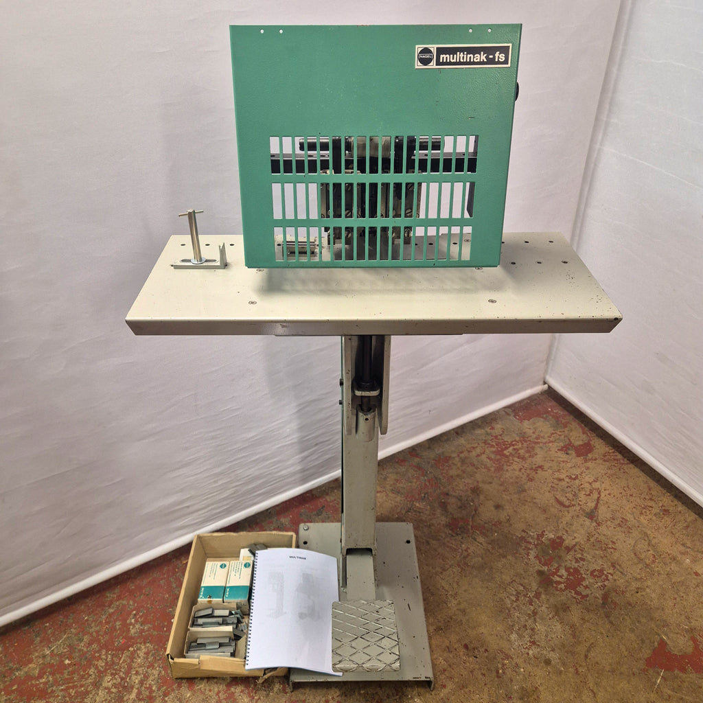 Used / Pre-owned Nagel Multinak FS heavy duty stapler. Twin-headed pad and booklet stapler with standard A - 24/ staple heads allowing you to staple up to 15mm. The machine is particularly efficient when it is used for frequently changing run lengths. Its versatility and durability have made it indispensable to the graphic arts industry. The change from flat to saddle stapling is done by simply flicking down the table.